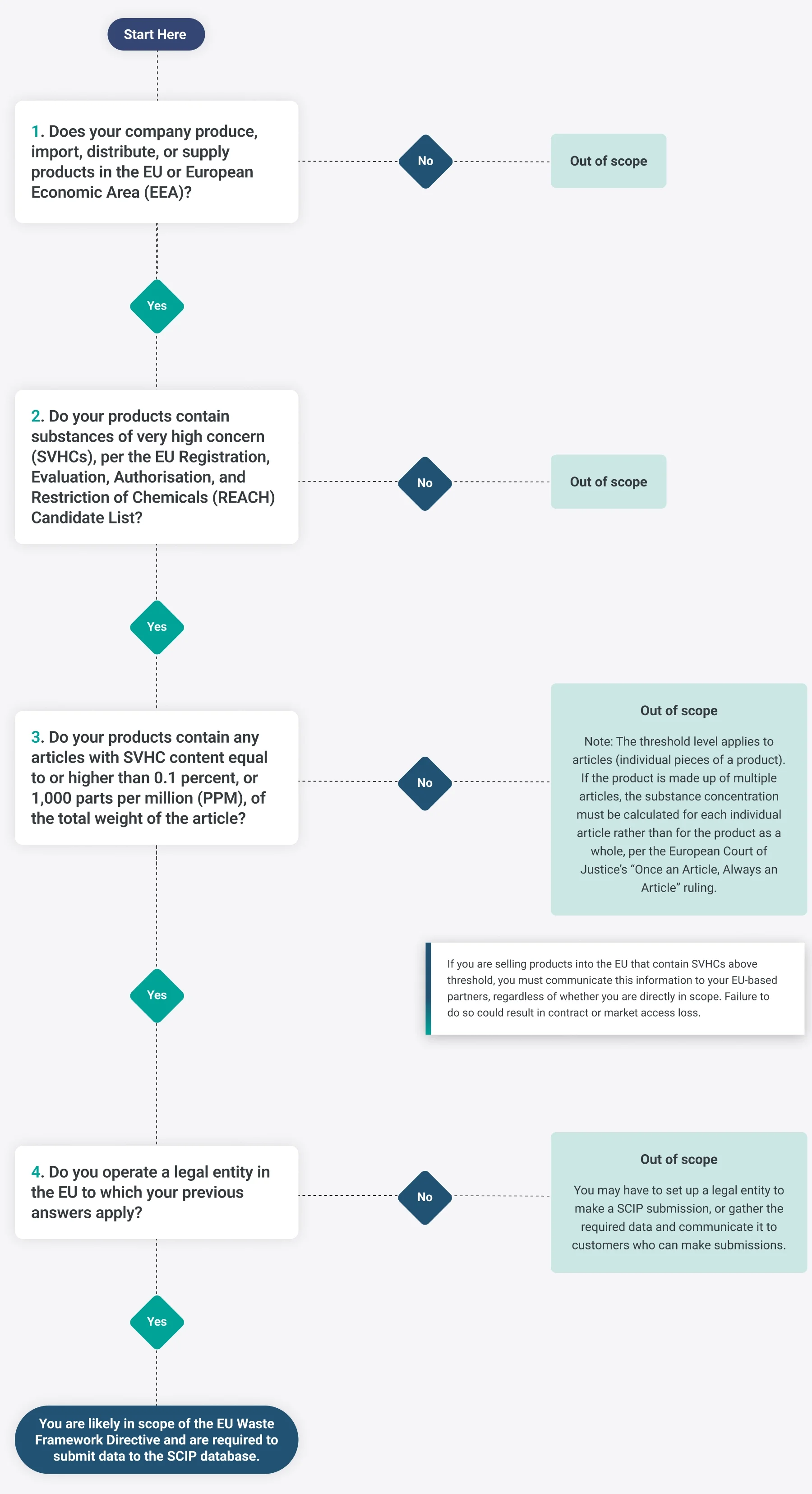 The following diagram will help you determine if you’re in scope of the EU WFD, and have a responsibility to submit to the SCIP database